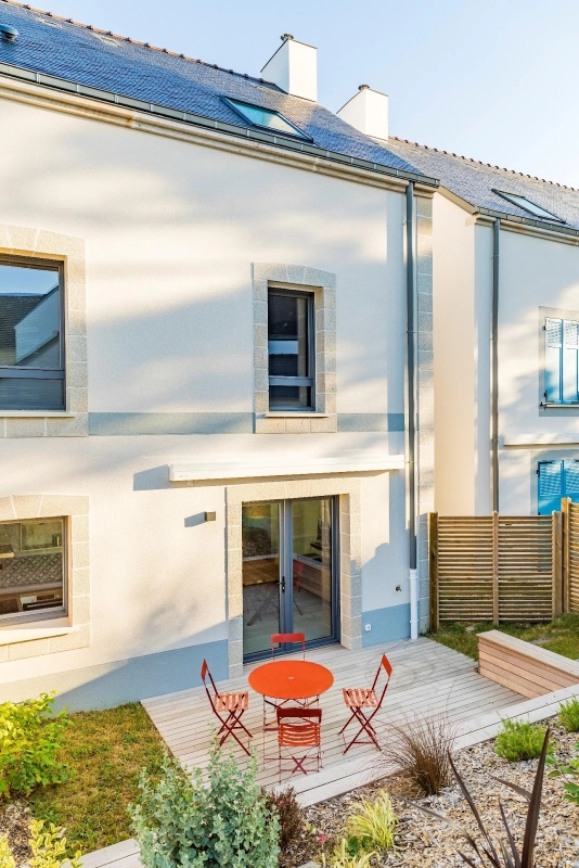 Chaque maison dispose d’un accès indépendant, de stationnements privatifs et d’espaces extérieurs aménagés pour profiter pleinement du climat marin.